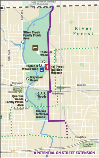 The Des Plaines River Trail is an improvement to the existing trail system, in an attempt to increase usability. The upgraded path will include various elevation changes, allowing its use for a greater period of time each year and will now connect each community on the trail down through River Forest to the Illinois Prairie Path. It is part of a larger, 10-mile multi-jurisdictional trail improvement project extending from Touhy Avenue in Park Ridge to the Illinois Prairie Path in Forest Park. The Des Plaines River Trail is a regional trail that provides alternative transportation and outdoor recreation opportunities for tens of thousands of users and has been identified by the Chicago Metropolitan Agency for Planning’s (CMAP) Northeastern Illinois Regional Greenways and Trails Plan as regionally significant. However, persistent flooding has caused considerable deterioration and safety concerns and is negatively impacting users’ experience of the trail. While the northern portions of the trail have been completed, River Forest is one of the last segments that remains. The proposed project will enhance the trail’s safety and usability and transform the Des Plaines River Trail into a reliable asset for commuters, residents, and visitors. The regional significance of this project is reflected in the more than $1 million already invested on planning, community engagement, and Phase I engineering by the Forest Preserve District of Cook County, CMAP, the West Central Municipal Conference, Active Transportation Alliance, River Grove, Franklin Park, River Forest, Rosemont, Park Ridge, and Schiller Park. (Overall Trail Location Map)