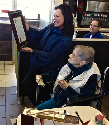 Prior to the Village Board meeting, Village President Cathy Adduci joined McDonald’s in celebrating the occasion. As expressed in the proclamation, Mrs. Affleck frequently enjoys ice cream cones at McDonald’s. To read the proclamation in its entirety, please click here.