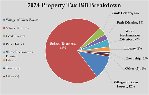 The Village finances between 23% and 27% of its operations through property taxes and is continually striving to diversify its revenue base in order to reduce reliance on the property tax. The Village's portion of the property tax reflects 12.00% of the total tax bill.