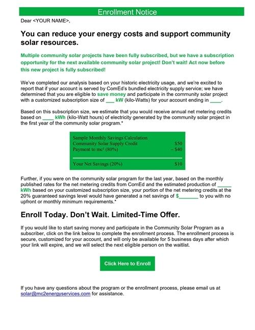 You will need your ComEd bill handy. You are not obligating yourself to participate by putting your name on the reservation list. Subscribers are enrolled on a first come, first served basis. MC2 will be handling the enrollment process and account administration.